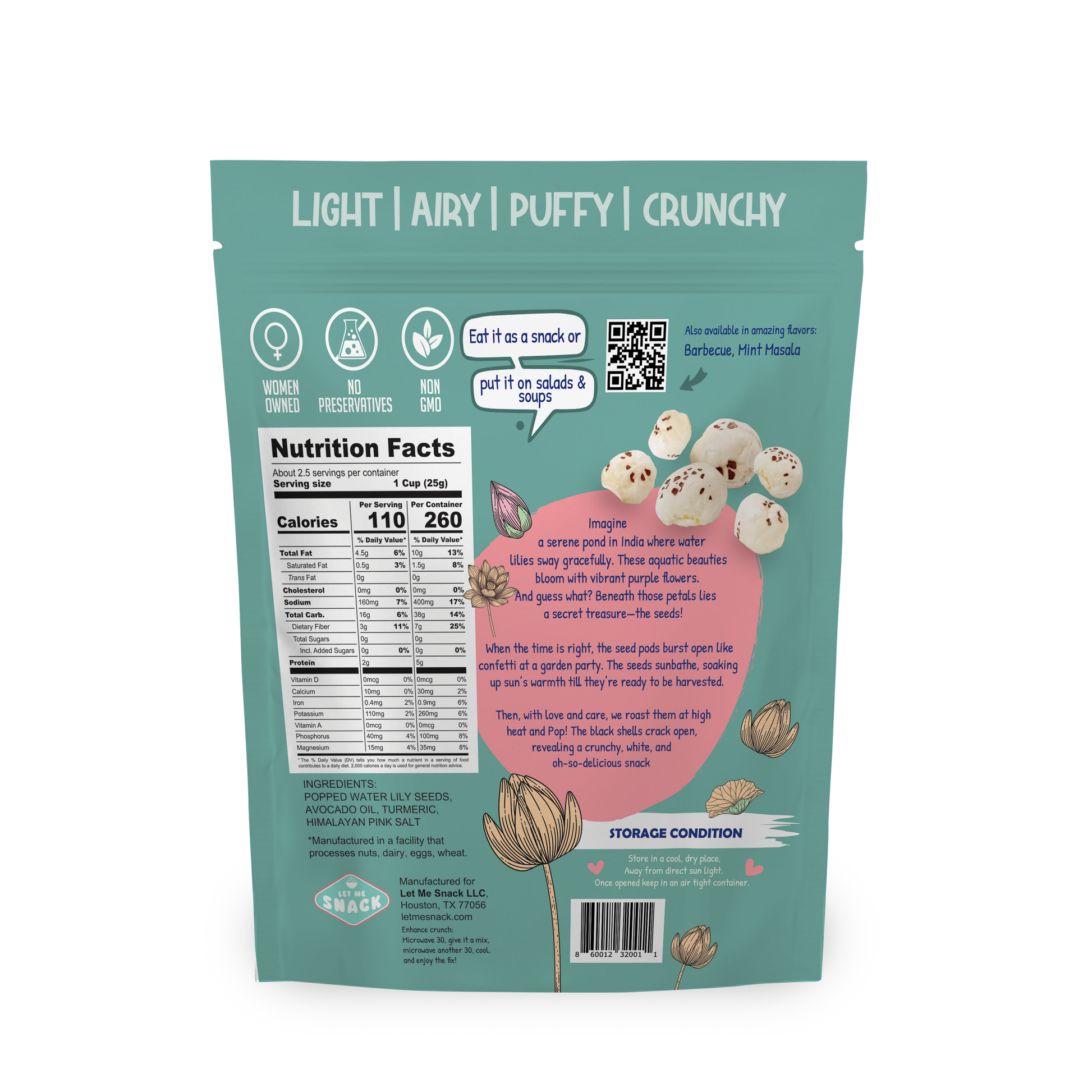Popped Water Lily Seeds, Avocado Oil, Turmeric, Himalayan Pink Salt.