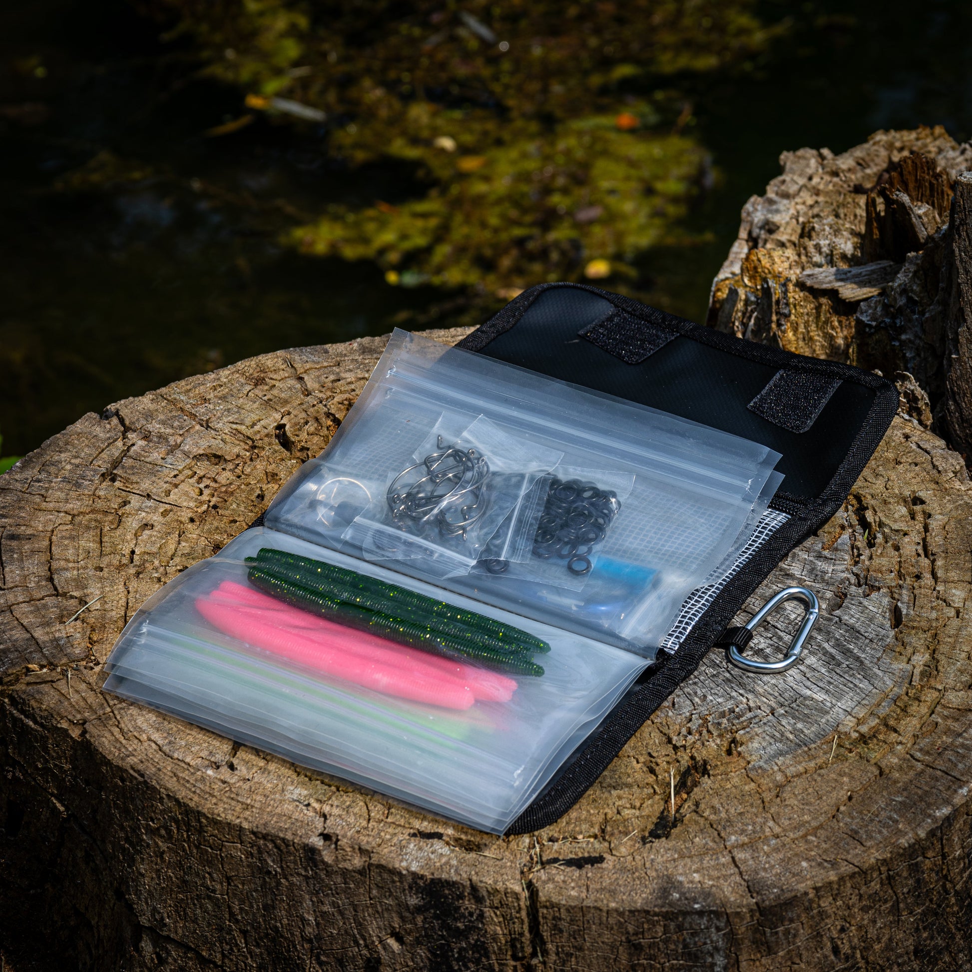 WACKY KIT: Everything you need for a successful day on the water; Includes (1)Soft carrying case- (12)5.5" Plastic worms- (1)Wacky tool- (10)Wacky hooks- (10)Texas rig hooks- and (75)O-rings